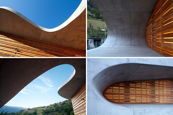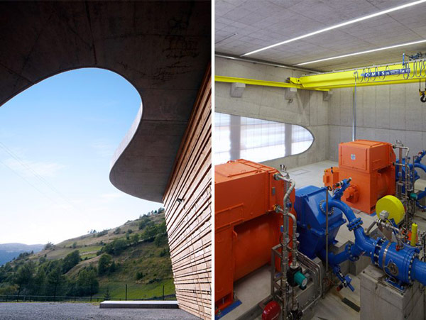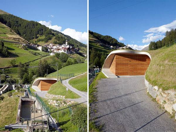 Бетонная плита, врезавшаяся в землю, выступает в качестве разделителя между ландшафтом и внутренним техническим блоком. Построенная из материалов природных цветов, гидроэлектростанция представляет не только функциональную ценность, но и эстетическую, став знаковой достопримечательностью итальянской провинции.